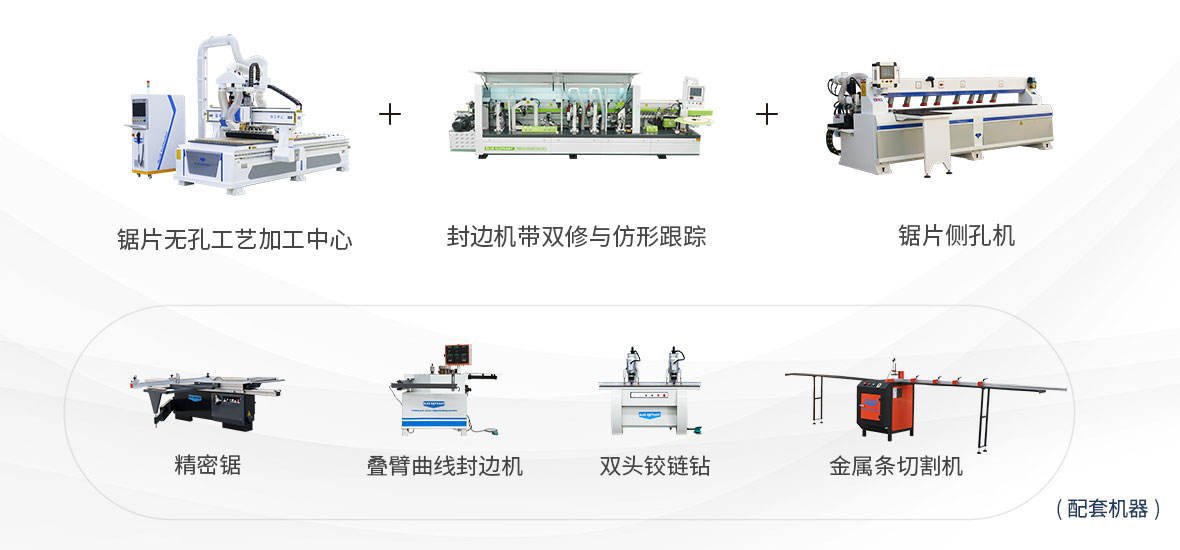?無孔工藝柜體生產(chǎn)解決方案無孔工藝柜體生產(chǎn)解決方案,主要由無孔工藝加工中心、鋸片側(cè)孔機(jī)、全自動(dòng)封邊機(jī)三種設(shè)備組成,可用于加工生產(chǎn)板式家具、櫥柜、衣柜、兒童家具等柜體的生產(chǎn)加工,滿足家具生產(chǎn)廠家對無孔家具(使用隱形連接件連接)、板式家具(使用二合一、三合一連接件)及普通板式家具的加工需求;